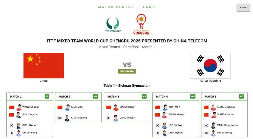 12月7日,2025年国际乒联混合团体世界杯半决赛,中国队将对阵韩国队。