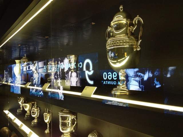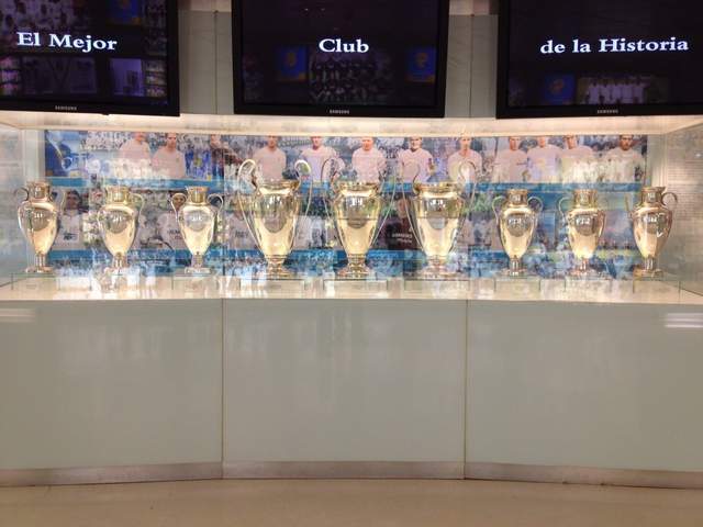 琳琅满目的俱乐部奖杯,欧洲冠军杯、欧盟杯、世俱杯、联赛冠军、国王杯等等。