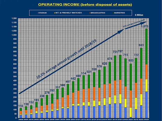 近20年收入,基本一直在增长,只是受限于新冠疫情,2020年到2022年收入有下降。而收入最多是商业合作,包括赞助商投资、商业开发合作等;然后是球场收入,包括门票、电视转播、比赛奖金和分成;再然后是广告收入,包括球衣广告、球场广告等;最后是国际友谊赛和周边商品销售,尤其是亚洲市场最近20年的大力开发。