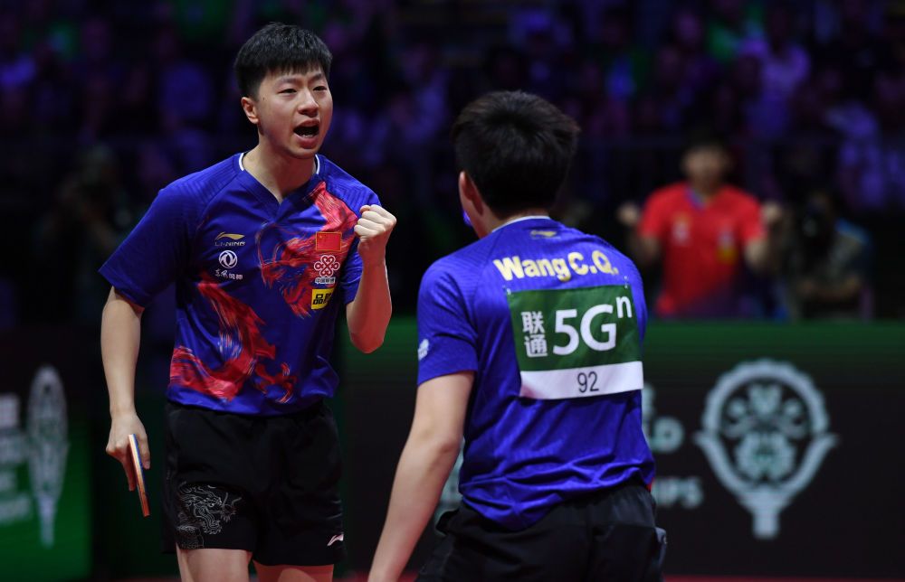 2019年4月27日,马龙(左)/王楚钦在匈牙利布达佩斯进行的2019世界乒乓球锦标赛男子双打决赛中庆祝得分。最终,他们夺得冠军。新华社记者 陶希夷 摄