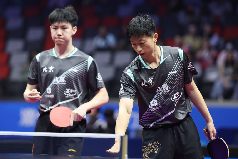2025年11月17日,北京队组合马龙(右)/黄友政在第十五届全国运动会乒乓球男子团体小组赛中。新华社记者 刘续 摄