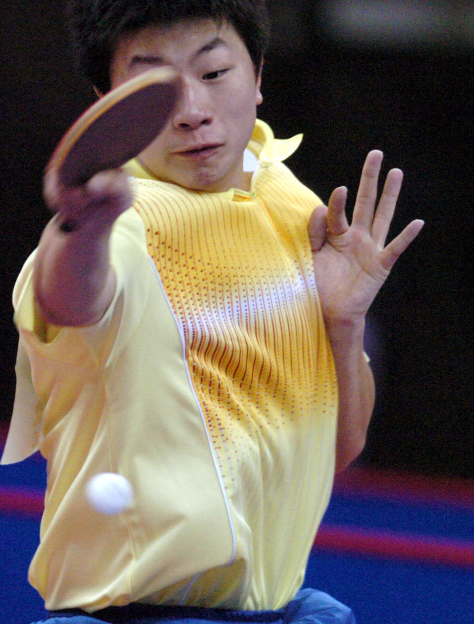 2005年10月11日,北京队选手马龙在第十届全国运动会乒乓球男子团体小组赛中。最终,北京队无缘八强。新华社记者 朱力 摄