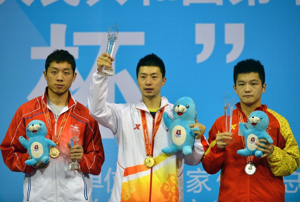 2013年9月10日,冠军北京队选手马龙(中)、亚军队选手樊振东(右)和季军上海队选手许昕在第十二届全国运动会乒乓球男子单打颁奖仪式上。新华社记者 朱峥 摄