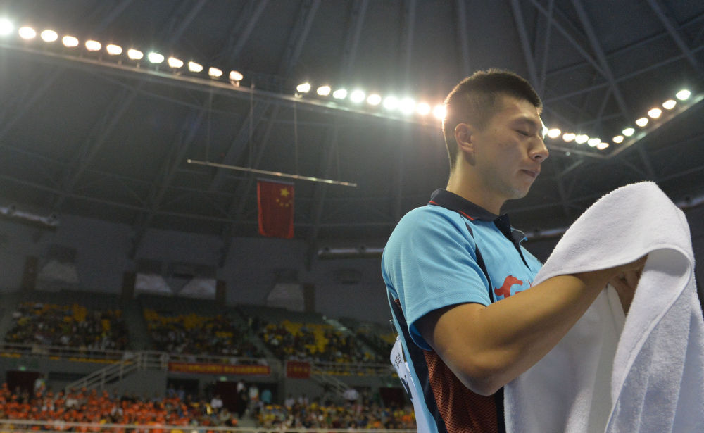 2013年9月4日,北京队选手马龙在第十二届全国运动会乒乓球男子团体半决赛中。北京队0比3不敌队,无缘决赛。新华社记者 杨青 摄