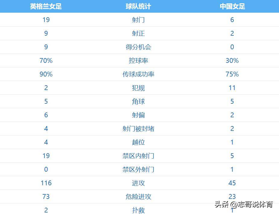 从全场来看,英格兰队几乎全面占优,射门19-6、射正9-2就取得了8个进球,控球率方面,英格兰队更是高达70%、中国队只有三成的控球率,全场没有打出让人印象深刻的进攻,这就是两队的差距,哪怕面对不是最强阵容的英格兰队,中国队别说赢球,进一个球都相当困难,差距可想而知。