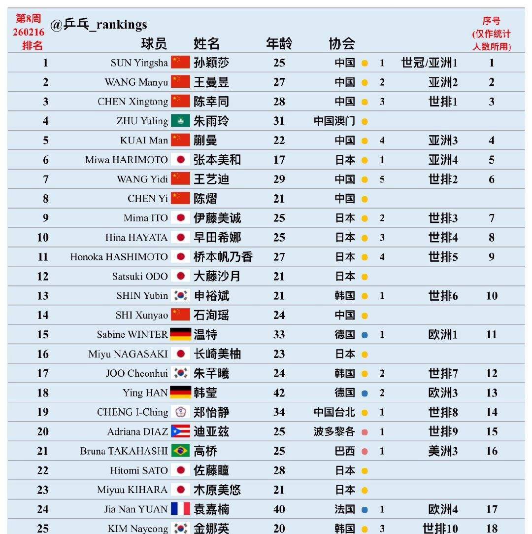 女队世界杯排名亦已发布,孙颖莎依托世乒赛和亚洲杯双料冠军的实力位居榜首,同时王曼昱、蒯曼和张本美和因为在亚洲杯进入四强获得参赛资格。陈幸同、王艺迪、伊藤美诚、早田希娜、桥本帆乃香及申裕斌则凭借世界排名顺利入围。欧洲方面,德国选手温特凭借欧洲16强杯冠军身份抢占了席位,而韩莹、袁嘉楠、斯佐科斯等若干选手因跻身该赛事四强也获得了参赛机会。非洲和大洋洲的高达与池旼亨、李春丽由于在各自洲际赛事夺得优异成绩,同样列入世界杯阵容。